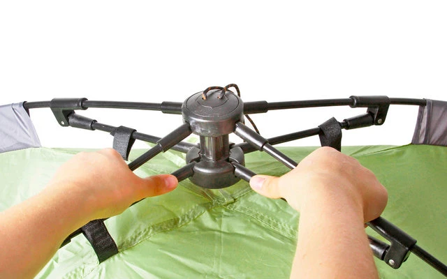 Automatik Kuppelzelt mit Doppeldach und praktischem Vorbau. Dank modernem Gestänge mit integrierter Seilzugtechnik sekundenschnell aufgebaut und einsatzbereit. Vormontierte Abspannleinen. Kompaktes Packmaß bei geringen Gewicht. Mit Packsack.