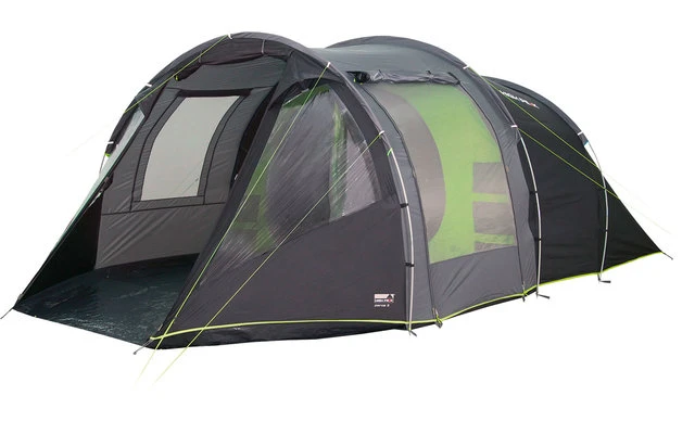 Familien-Tunnelzelt in Stehhöhe. Der große Vorbau mit Gaze-Seitentür und Gazefenster kann optimal belüftet werden und bietet reichlich Platz für die Campingausrüstung und Aufenthalt bei schlechtem Wetter. Klarsichtfolienfenster bringen das Tageslicht in die Wohnung und die Gardinen schützen vor neugierigen Blicken. Der pflegeleichte Zeltboden, am Innenzelt angenäht, kann sich nicht verschieben. Die Faulstreifen halten Schmutz und Feuchtigkeit ab. 3 Dauerventilationen belüften das Zelt bei jeder Wetterlage optimal und müssen immer geöffnet sein. Das Zelt hat extra starke Reißverschlüsse und reflektierende Abspannschlaufen für mehr Sicherheit. Die sehr stabilen 5 mm Durchmesser Stahl-Erdnägel verbiegen sich auch bei hartem Untergrund nicht. Für die Abspannung werden spezielle 5 mm Stahl- Erdnägel mit Haken für besseren Halt der Spannleinen geliefert. Die Reißverschluss ‚Abdeckung ist mit einer zusätzlichen Regenrinne ausgestattet.